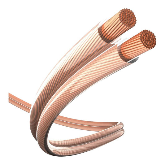 Dois condutores paralelos (geralmente vermelho/preto) em cobre, vendidos a metro. É a solução mais comum para sistemas estéreo, hi-fi e home cinema. Escolhe a bitola (AWG) em função da distância e da impedância das colunas: até ~10 m em 6–8 Ω, 16 AWG é suficiente; 10–20 m ou 4–6 Ω, 14 AWG; acima disso, 12 AWG.