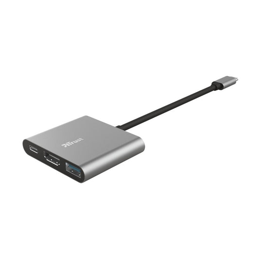 Adaptador Hub USB-C Macho para HDMI Fêmea / USB-A / USB-C PD / Trust Dalyx 3 IN 1 / 10cm / Cinza