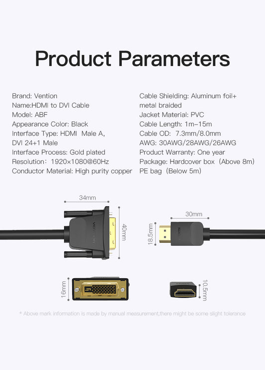 Cabo HDMI para DVI (24+1) Vention ABFBJ / 5 metros / 4K / 60Hz / 1080P / 60Hz