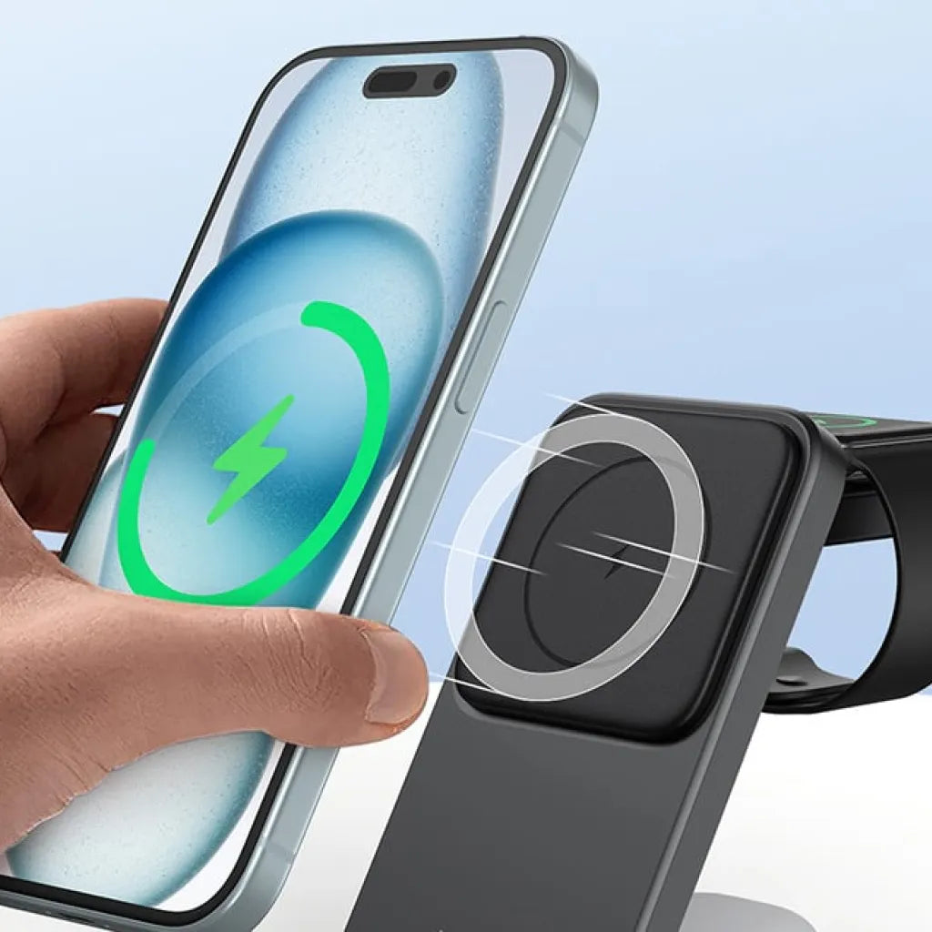 Compatibilidade 3-em-1: O carregador permite carregar até três dispositivos ao mesmo tempo – iPhone, Apple Watch e AirPods – através da tecnologia de carregamento magnético e sem fios.
