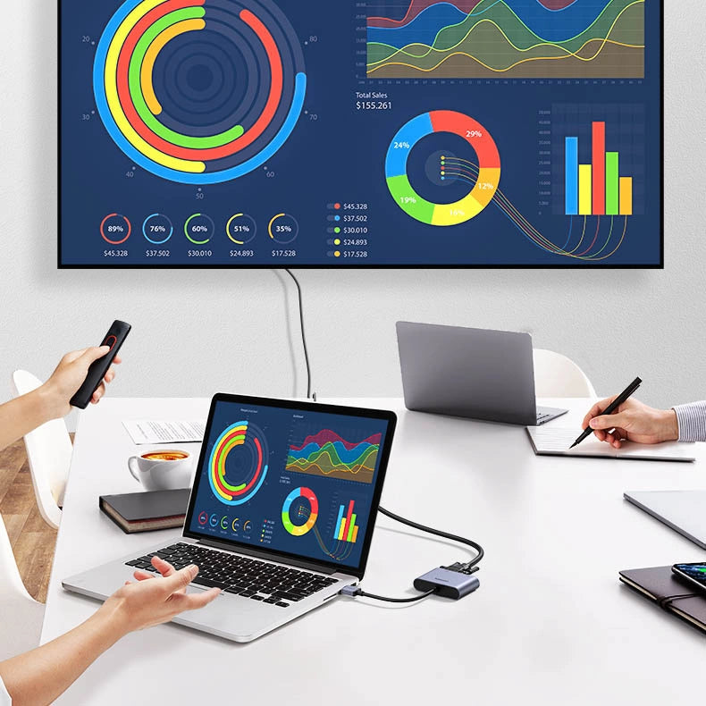 Que tal veres a apresentação em Power Point num ecrã ligeiramente maior para melhor apresentar os pressupostos nela contidos? Ou talvez queiras ver as fotografias das tuas férias no seu televisor? O adaptador de vídeo USB-C - HDMI + VGA da Ugreen foi criado para este efeito. Este pequeno acessório facilitará a ligação de um portátil moderno a um televisor ou projetor através de um cabo VGA ou HDMI .