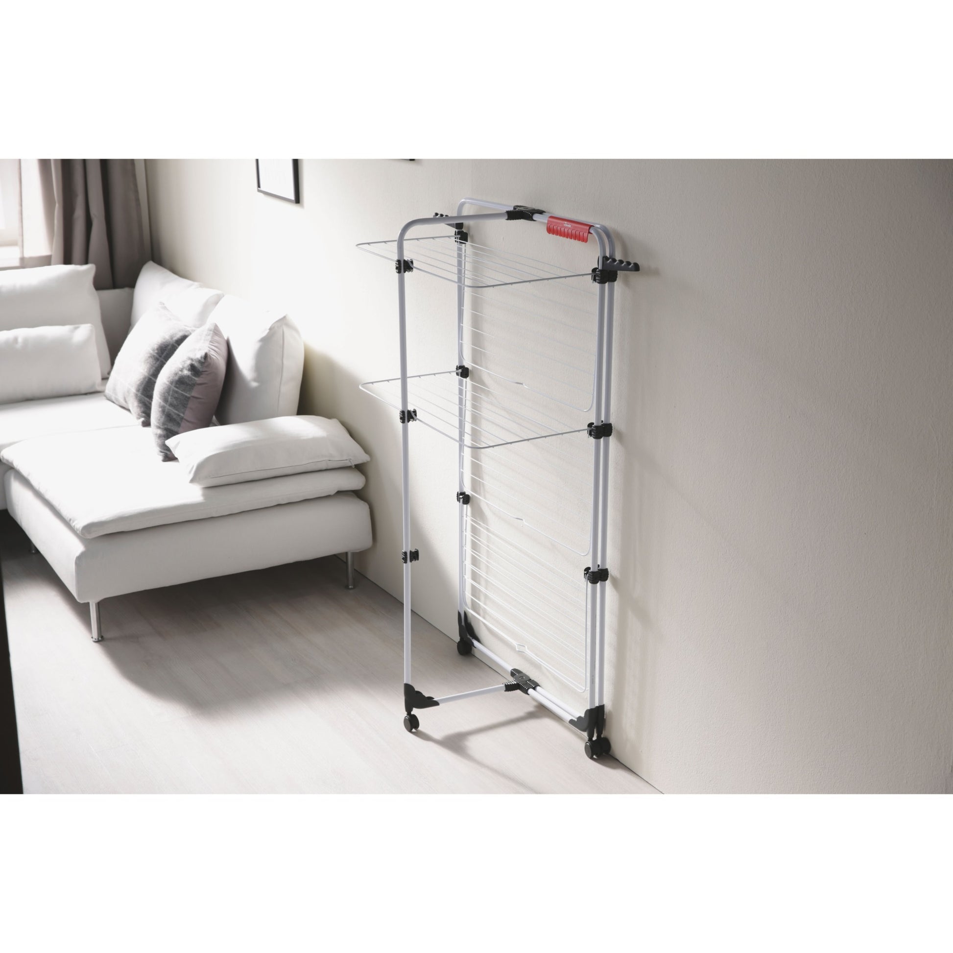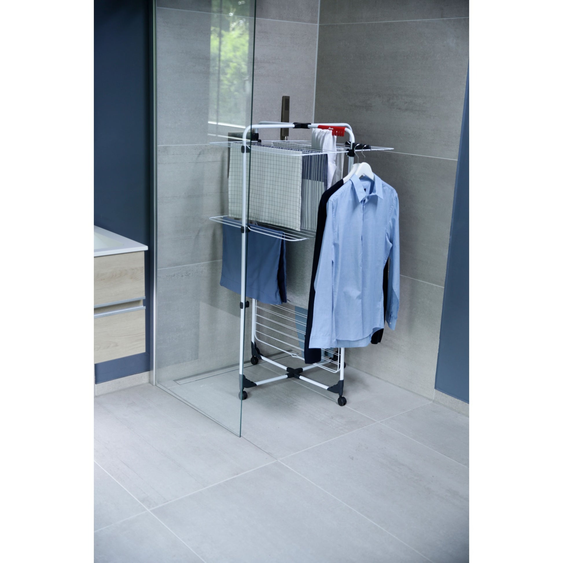 O estendal vertical Vileda Mixer 3 é a solução prática para quem precisa de secar muita roupa sem ocupar espaço excessivo. Com 30 metros de área de secagem distribuídos por vários níveis, permite secar várias cargas ao mesmo tempo de forma organizada e eficiente.