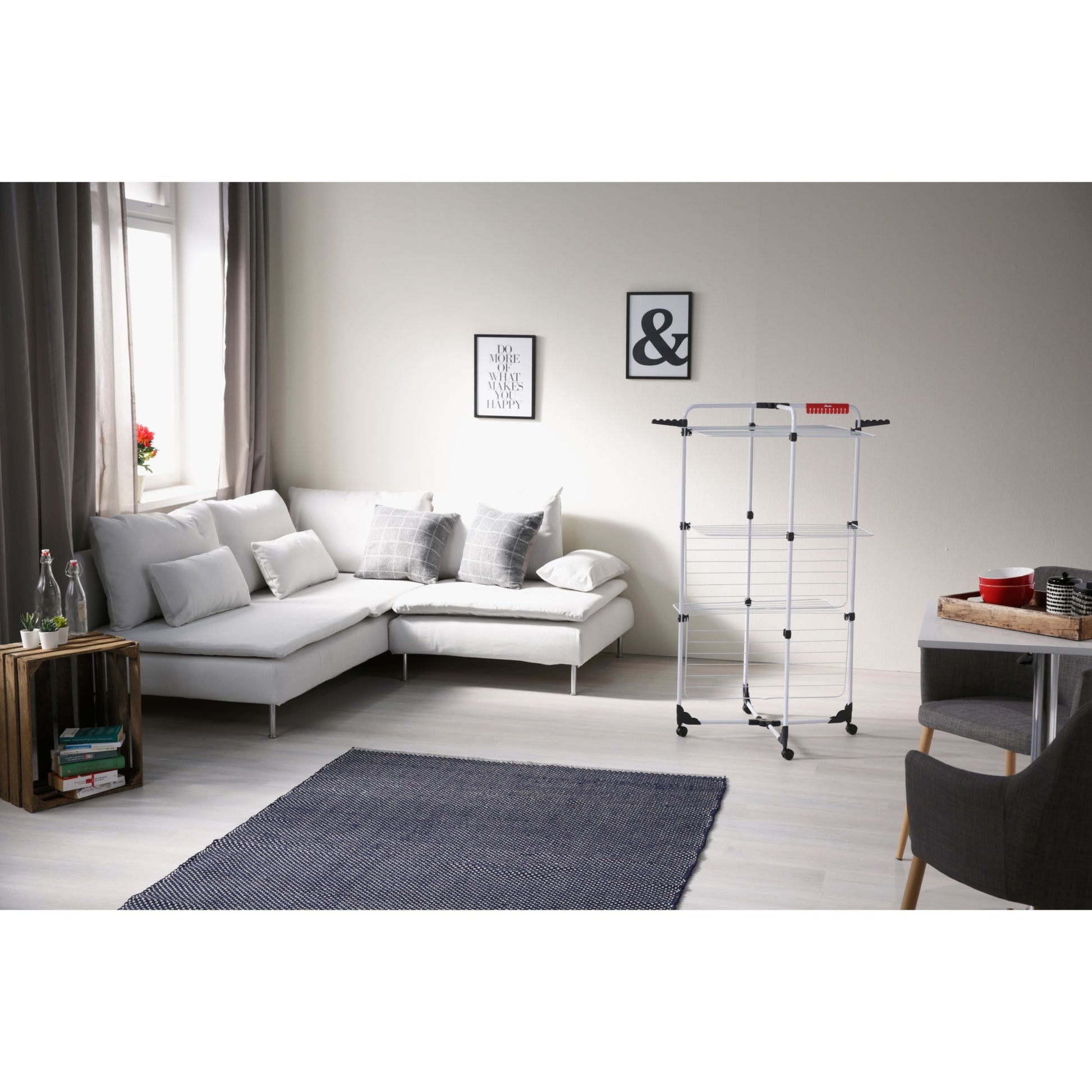 O design vertical é ideal para casas, apartamentos e varandas mais pequenas. As prateleiras ajustáveis facilitam a colocação de peças grandes como toalhas, lençóis ou calças, mantendo tudo bem distribuído para uma secagem uniforme.