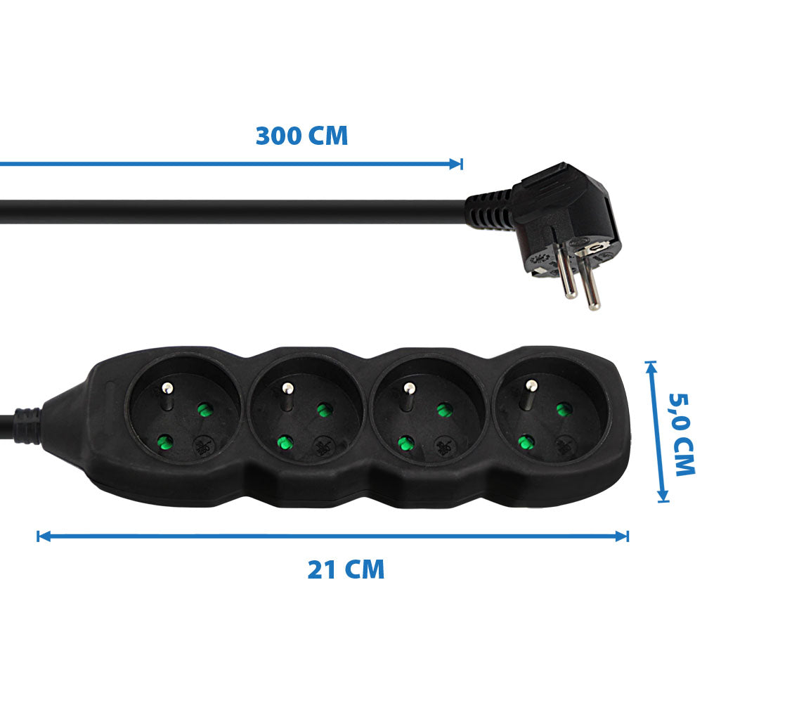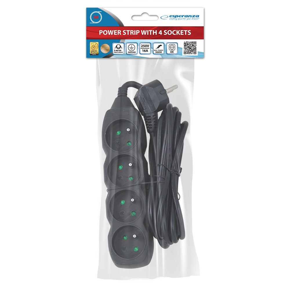 A extensão eléctrica ESPERANZA é uma solução de alta qualidade para escritórios, casas e outros locais que necessitem de uma alimentação eléctrica constante. Garante uma funcionalidade fiável e segurança na utilização diária. A sua construção durável e o design de fácil utilização garantem uma alimentação duradoura sem preocupações com os dispositivos ligados. Quatro tomadas permitem o fornecimento simultâneo de energia a vários dispositivos, enquanto o cabo de 3m proporciona flexibilidade no posicionamento da extensão.