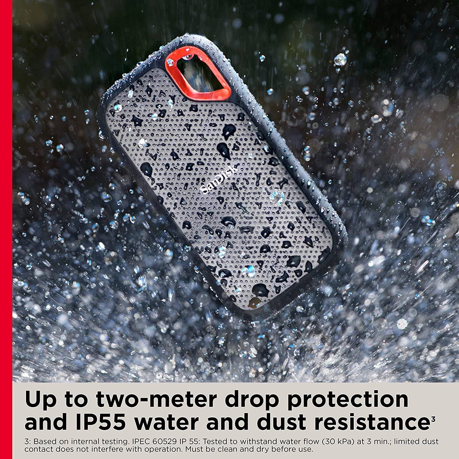 O SSD Portátil SanDisk® Extreme reforçado oferece transferências de alta velocidade de leitura de até 1050MB/s. Isso faz com que ele seja perfeito para guardar e editar fotos e vídeos de alta resolução. Com uma classificação IP55, ele também é resistente a chuva, pingos, derramamentos e poeira.